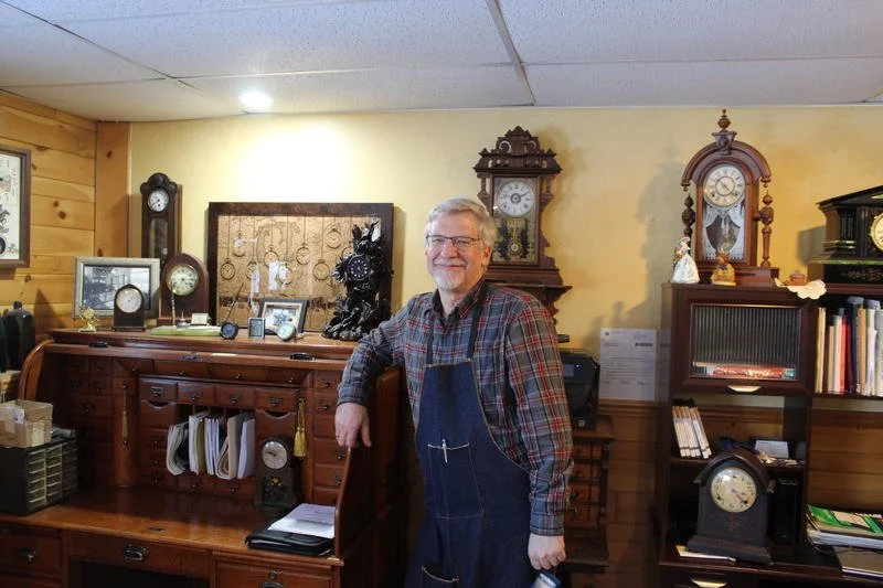A smiling man in a plaid shirt and apron standing in a room filled with vintage clocks and decor.